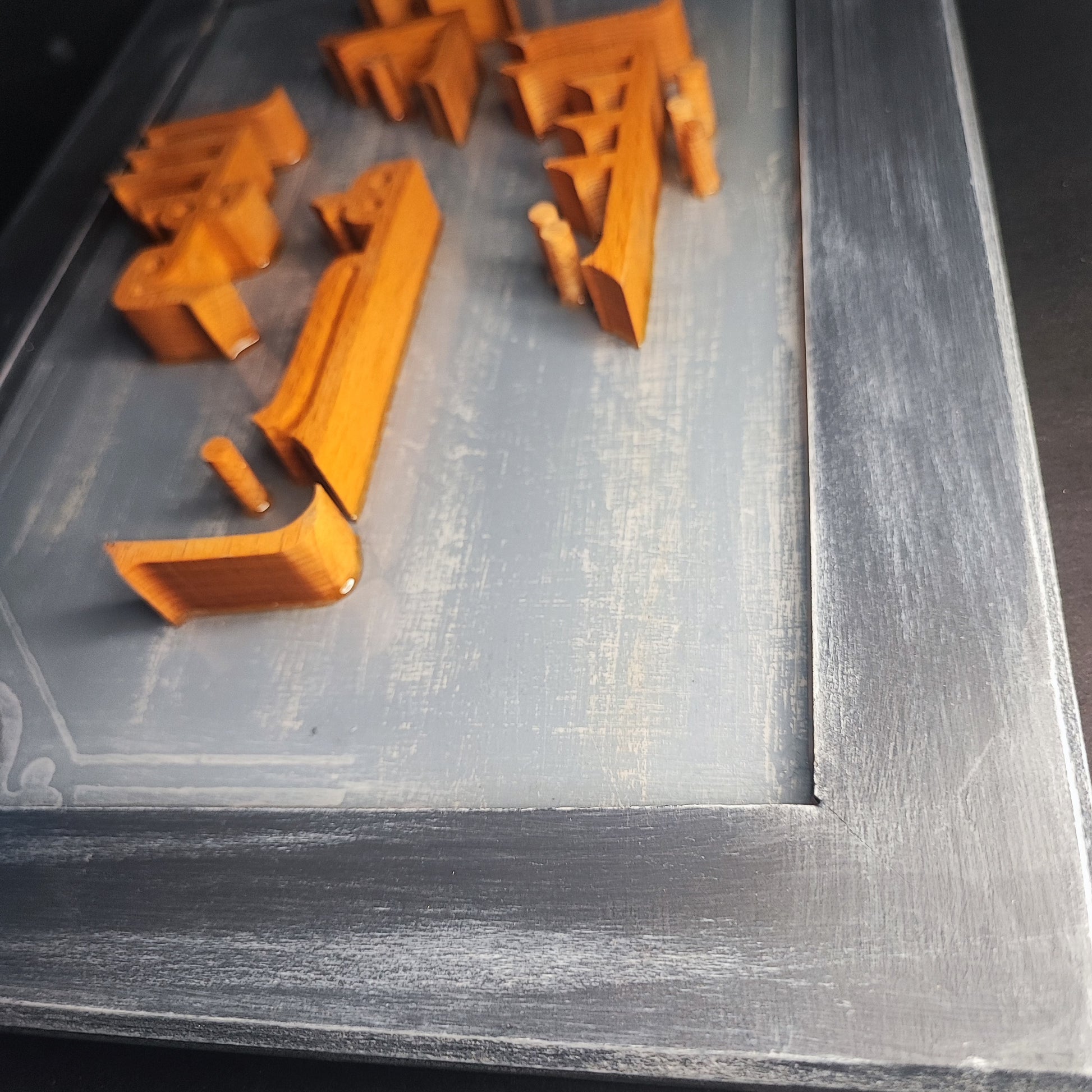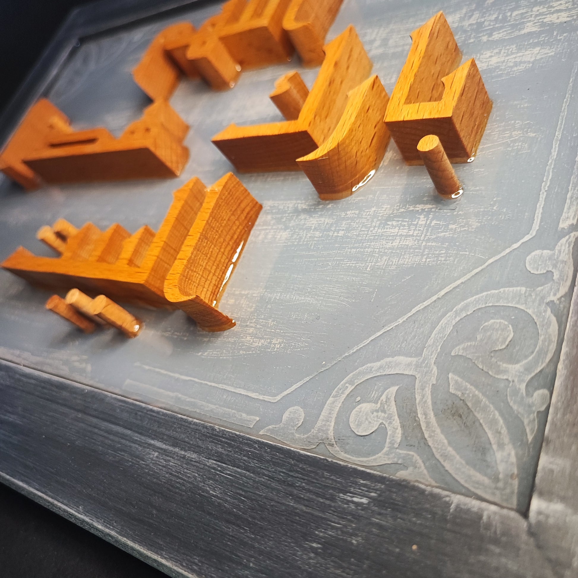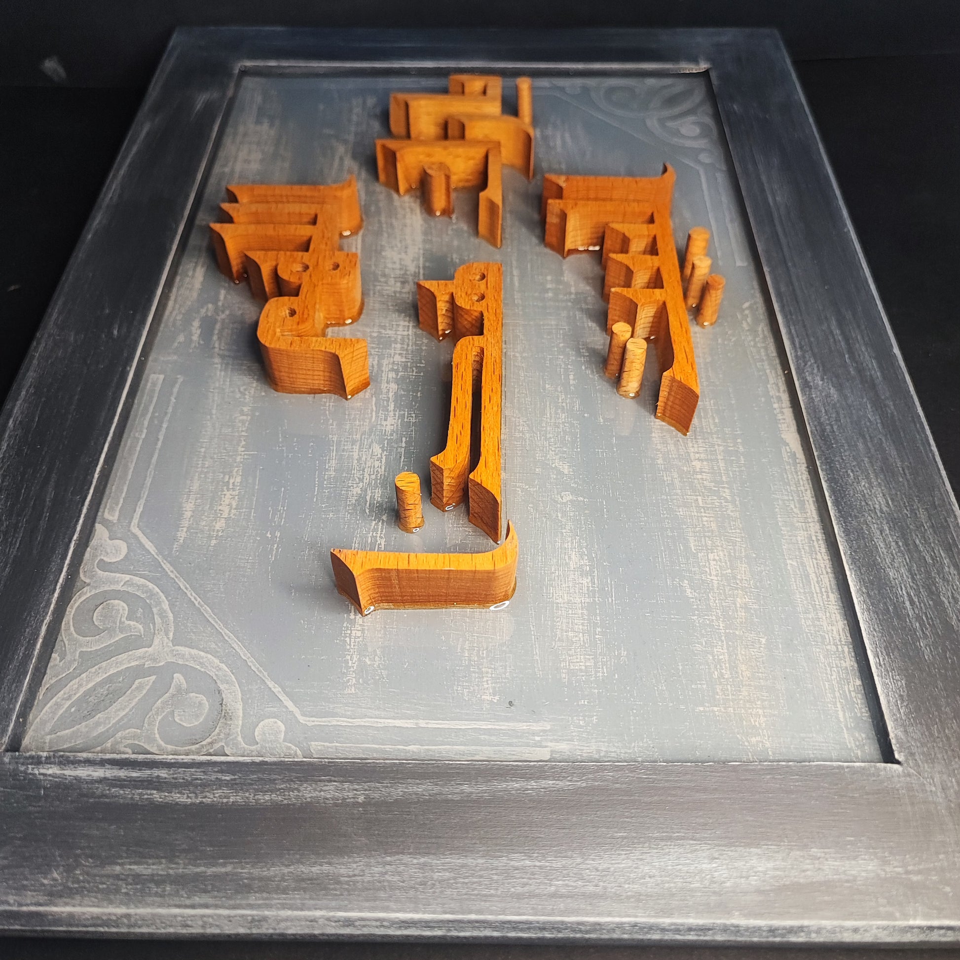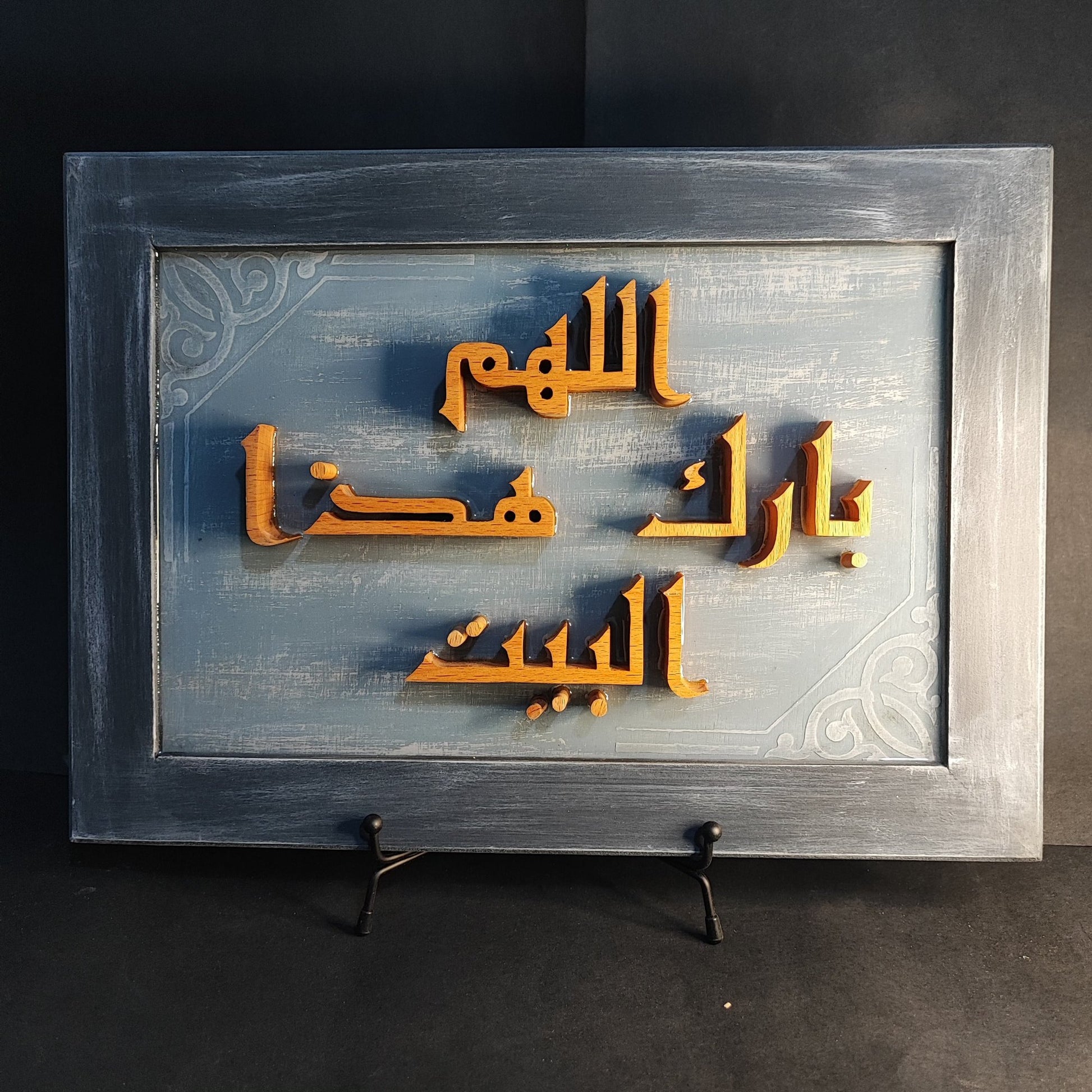 لوحة( اللهم بارك هذا البيت) بالخط الكوفي حفر يدوي من خشب الزان و تنفيذ يدوي بالكامل مع إضافة الريزن الشفاف بالخلفيه